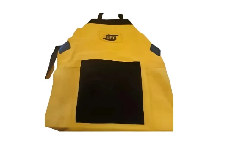 Delantal de descarne amarillo con tiras y refuerzos en color negro, con estampado ESAB e ISO 11611