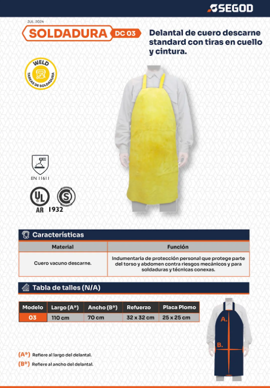 DELANTAL CUERO DESCARNE 70X110CM CON TIRAS CUELLO Y CINTURA SEGOD (DC03)
