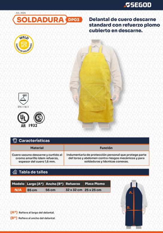 DELANTAL CUERO DESCARNE 85X56CM CON REFUERZO PLOMO SEGOD (DP03)