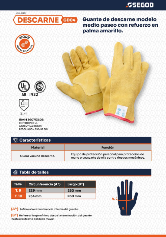 GUANTE DESCARNE 1/2 PASEO CON REFUERZO EN PALMA TALLE:9 SEGOD (GD04)