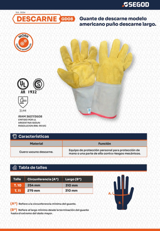 GUANTE DESCARNE AMERICANO PUÑO LARGO TALLE:11 SEGOD (GD08)