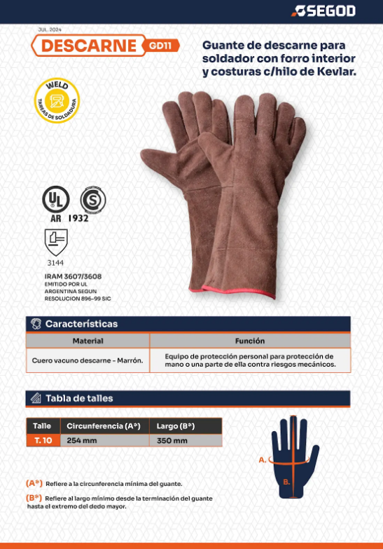 GUANTE DESCARNE PARA SOLDADOR FORRADO COLOR MARRON TALLE:10 SEGOD (GD11M)