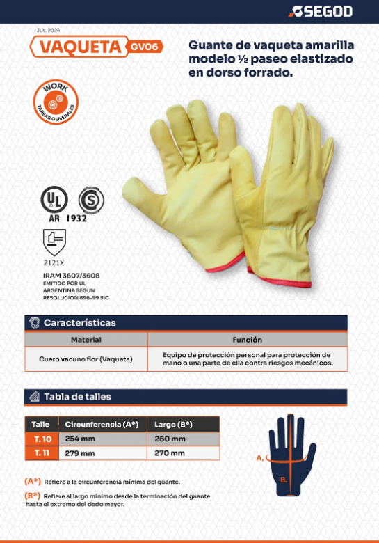 GUANTE VAQUETA AMARILLO 1/2 PASEO ELASTIZADO FORRADO TALLE:10 SEGOD (GV06)