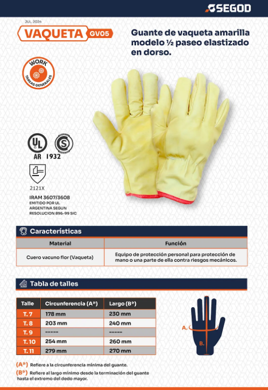 GUANTE VAQUETA AMARILLO 1/2 PASEO ELASTIZADO TALLE:9 SEGOD (GV05)