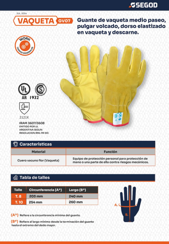 GUANTE VAQUETE AMARILL.1/2 PASEO ELASTIZADO DESCARNE TALLE:10 SEGOD (GV07)
