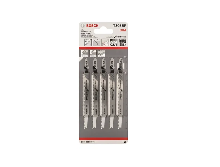 La hoja de sierra de calar T 308 BF Extra-Clean for Hard Wood proporciona cortes rectos y extralimpios en madera. Sus dientes fresados con precisión y con cuerpo cónico rectificado cortan limpiamente. Además, dos hileras de dientes dispuestas con ángulos distintos proporcionan cortes sin desgarrar las superficies superior e inferior. La hoja BIM (bimetálica), con una tira de dientes de HSS (acero de alta velocidad) totalmente endurecido unida a un cuerpo muy elástico de HCS (acero de alto contenido en carbono), resulta adecuada para cortar materiales duros como madera dura y materiales para trabajo en madera abrasivos. Cuenta con geometría de diente 2,2XC, espacio entre dientes fino (2,2 mm) y gran longitud (117 mm) para cortar materiales de madera sólida con grosores de 5-50 mm. Para utilizar con sierras con sistemas de sujeción con vástago de una sola leva.