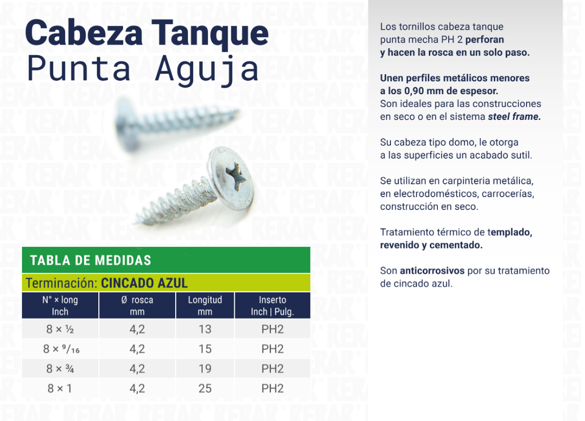 Tornillo autoperforante cabeza tanque con punta aguja ranura PH2. En un solo paso perfora y hace la rosca. En su proceso productivo recibe un tratamiento térmico de cementado, templado y revenido. Su terminación es cincado plateado. Es utilizado para la construcción e industria para la unión de perfiles de espesor menores a los 0,90 mm; en steel framing o construcción en seco; carpintería metálica; cartelería; mobiliario; toldos; etc. Vienen en unidades por sobre y su cantidad varía según la medida del tornillo.
