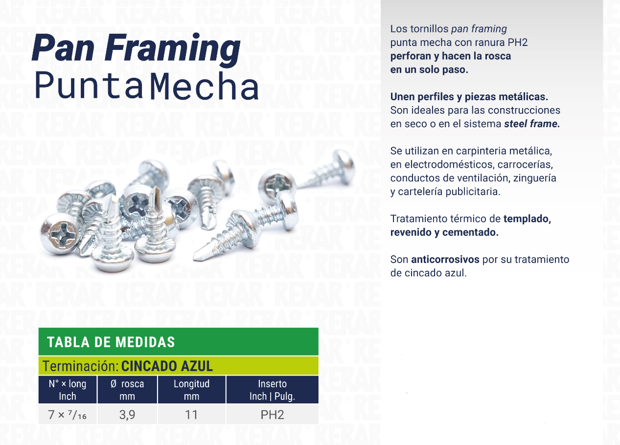 En un solo paso perfora y hace la rosca. En su proceso productivo recibe un tratamiento térmico de cementado, templado y revenido. Su terminación es cincado plateado. Se usa para la unión de perfiles y piezas metálicas. Se aplica en steel frame; carpintería de aluminio; cielorrasos metálicos; zinguerías; conductos de ventilación; cartelería metálica; etc.