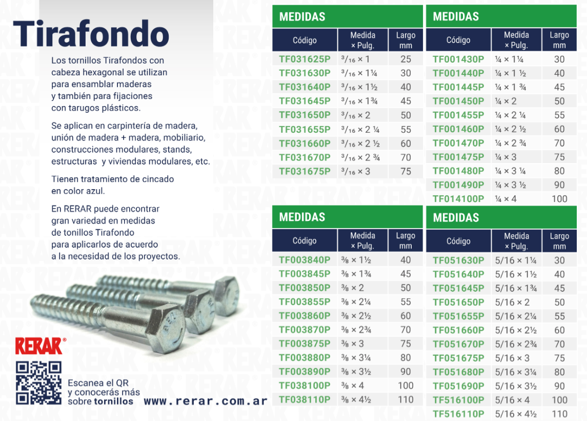 TORNILLO TIRAFONDO 3/8" X 50MM X 100 UNIDADES RERAR