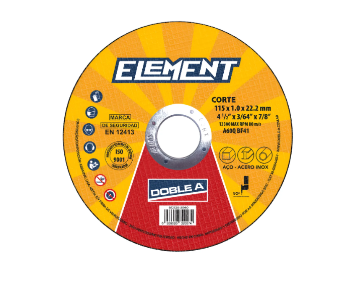 Los discos de corte y desbaste Element son el aliado ideal en los proyectos. Se destacan por su excelente costo, cumpliendo todas las normas de seguridad sin perder la calidad necesaria para un trabajo productivo y eficaz. Los discos de corte y desbaste Element poseen 2 mallas en discos de corte y 3 mallas en discos de desbaste que potencian el aprovechamiento del disco evitando el desprendimiento del grano.