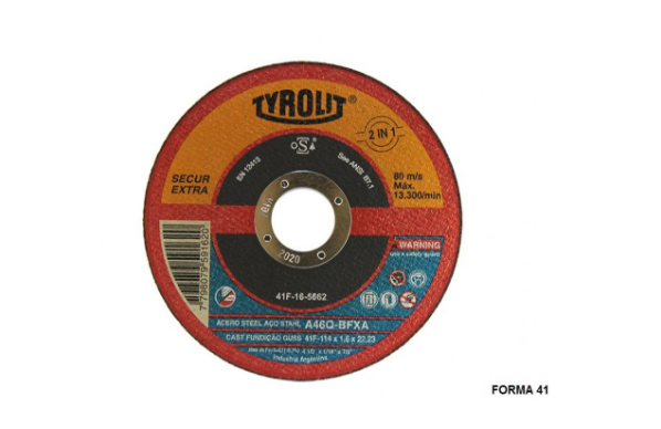 Los discos abrasivos TYROLIT SECUR EXTRA 2 en 1 son indicados para el corte de planchuelas, chapas, perfiles, tubos de acero y fundición. Estos materiales son fácilmente cortados con menor desperdicio de material, superficies más limpias, mínimas rebabas y cortes más rápidos.